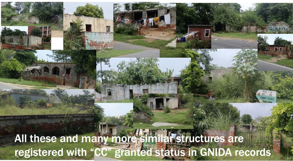 In Ebony Estate (Phi-IV), only 7-8% of plots host properly built, occupied homes. Another 7-8% are abandoned, lacking completion certificates and facing heavy penalties. Astonishingly, nearly 85% have obtained CCs but are abandoned or falling into ruins. These structures are low-quality “shells” built merely to secure certificates, often lacking essential amenities like functioning kitchens or toilets. Several vacated plots have illegal occupants—caretakers or economically weaker groups—living in dilapidated conditions.